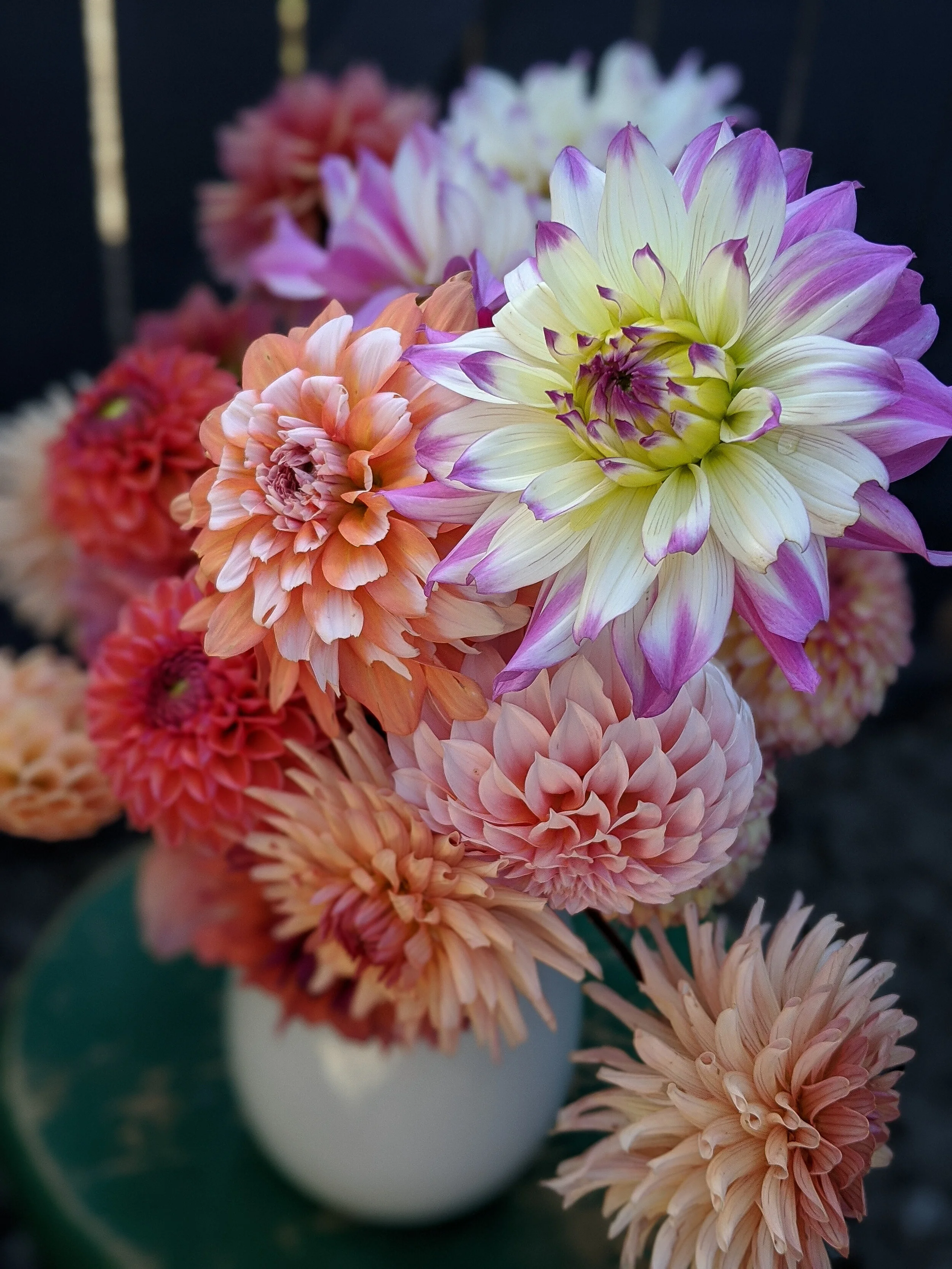 Each week features a mixed arrangement of dahlias and seasonal blooms. Mid-season the arrangements are dominated by dahlias. Bouquets are hand-tied in craft paper and last 5-7 days.